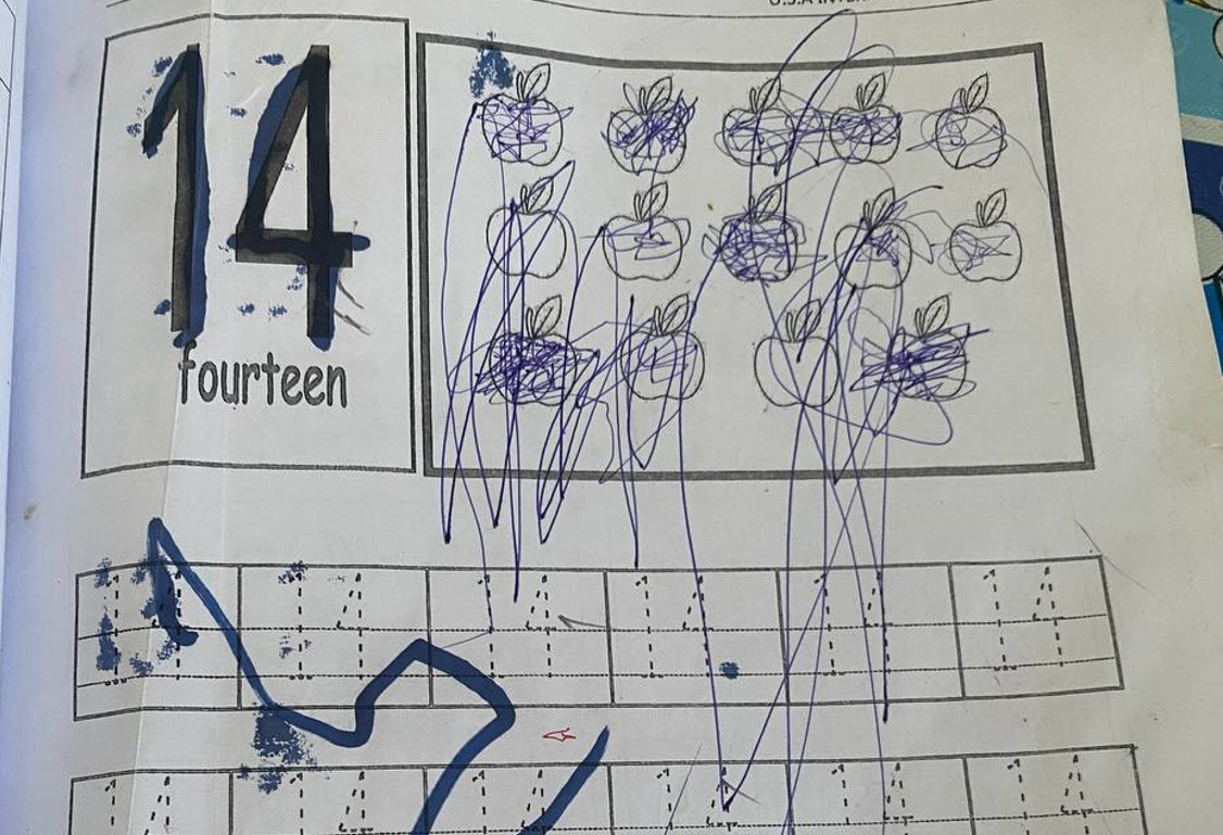Math worksheet with number 14 covered in blue scribbles showing child's writing fatigue.