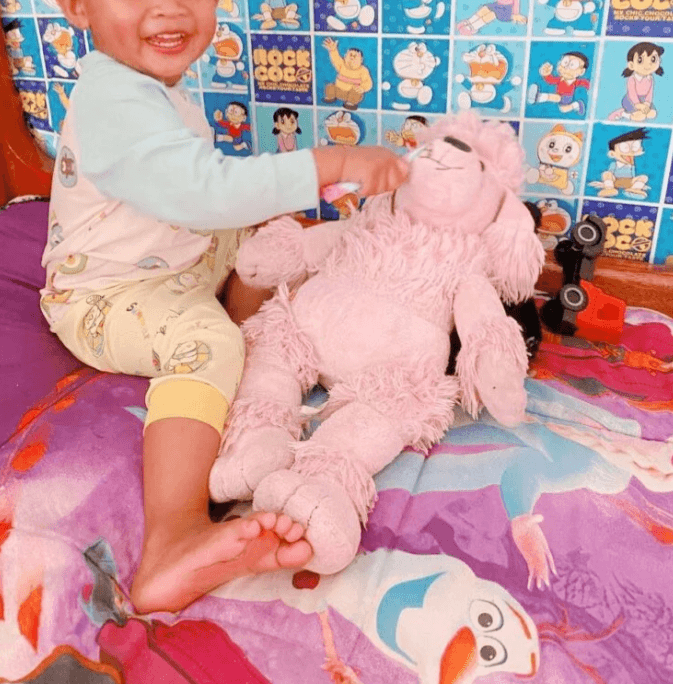 This is the most important part. Hand the toothbrush to your toddler and ask them to clean the toy’s teeth. Let them go wild with it.